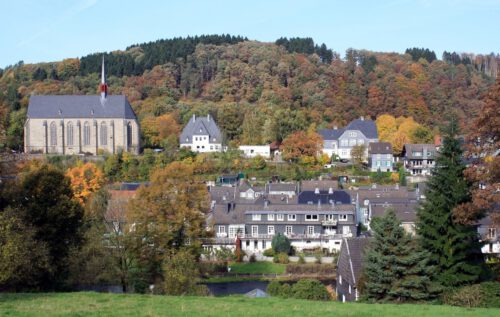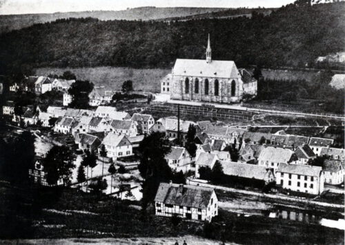 Altbeyenburg mit Klosterkirche und erstem Schulgebäude links dahinter um 1900