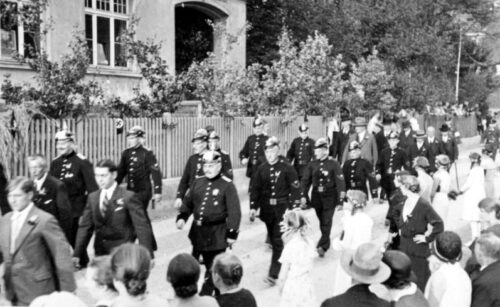 In den 1930er Jahren befand sich vor der Schule noch ein Zaun wie hier bei einem Umzug am Erntedankfest 1934